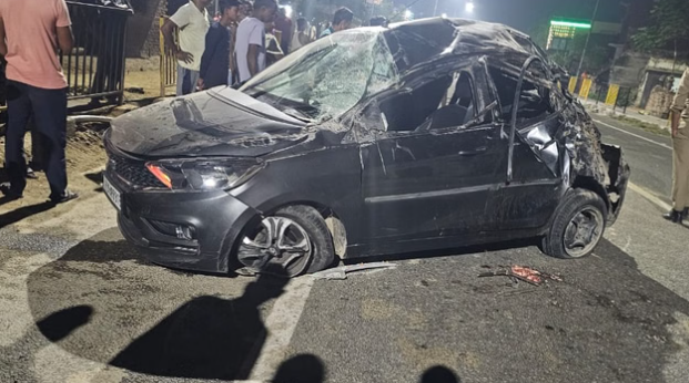 A horrific road mishap claimed one life and left six others seriously injured in Uttar Pradesh’s Pilibhit district late Thursday night. The speeding car lost control, flipped multiple times, skidded over 100 meters, and collided with a roadside railing, with three of its tyres bursting in the chaos.